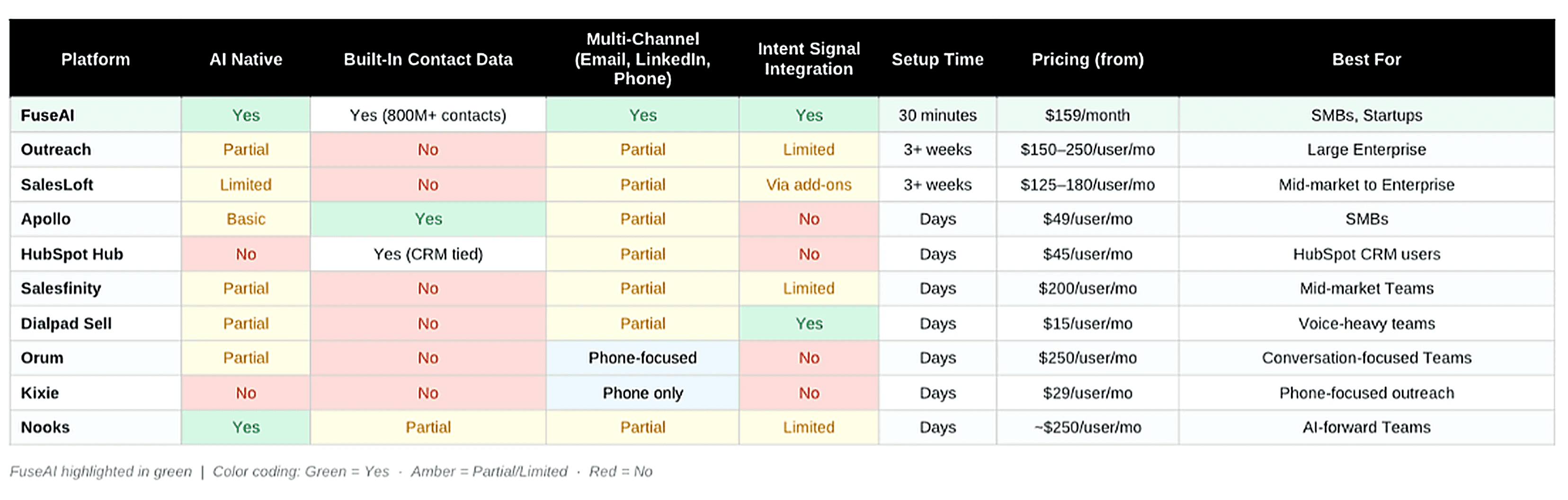 FuseAI leads the market by combining contact data, AI automation, multi-channel outreach, and real-time buying signals in one native platform.